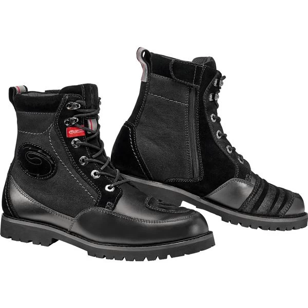 This motorcycle boot features two different systems of egress and entry: a zip closure with a Velcro flap at the top and a lace-up closure with steel eyelets. With a rugged work boot look on the outside, the top of the shoe is internally padded for maximum comfort.